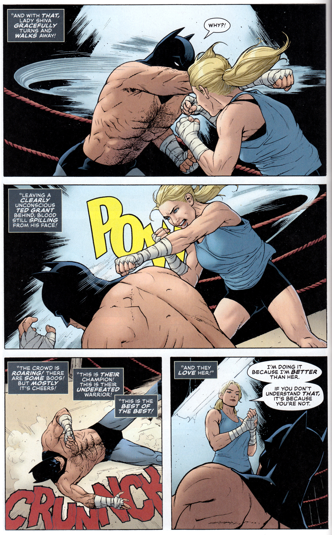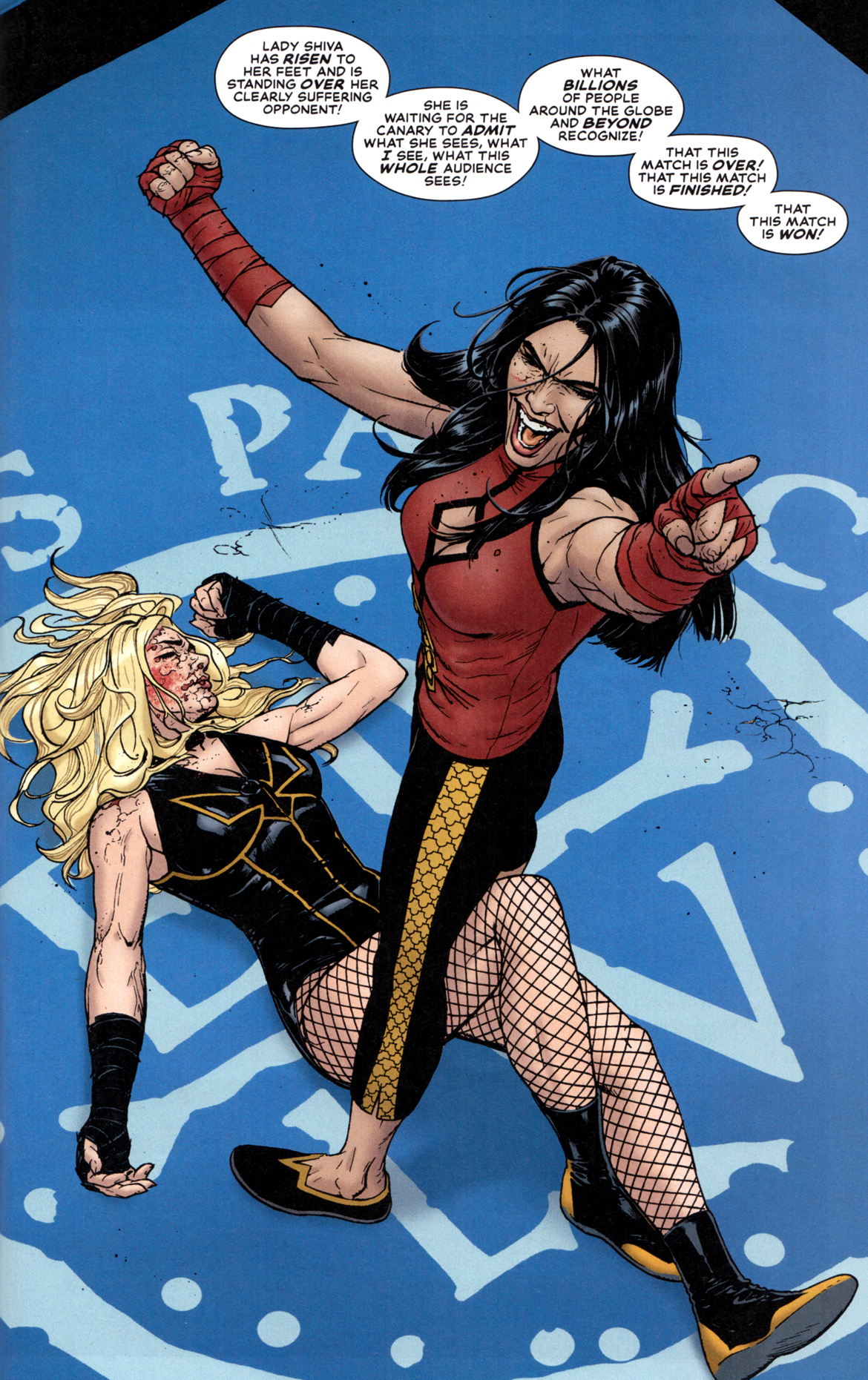 In dieser Miniserie tritt Black Canary gegen Lady Shiva an und ihr Battle wird als Mixed-Martial-Arts-Event rund um den Globus übertragen, und zwar aus einen Casino in Las Vegas, kommentiert von zwei Sportfritzen, über deren Gelaber sich der Comic auch lustig macht.