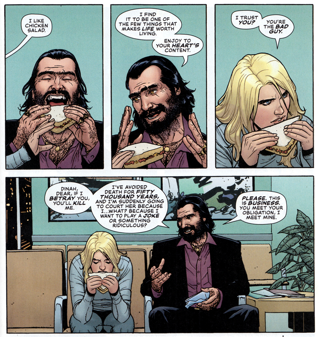 Das erfahren wir in zwischengeschnittenen Rückblenden, in denen sich Dinah mit dem geheimnisvollen Vandal Savage trifft. Savage ist eine mythische Figur aus der DC-Steinzeit, ersonnen als 50.000 Jahre alter Cro-Magnon-Krieger, in dessen Blut heilende Substanzen zirkulieren, die ihm Unsterblichkeit garantieren und andere von Krankheiten befreien können.