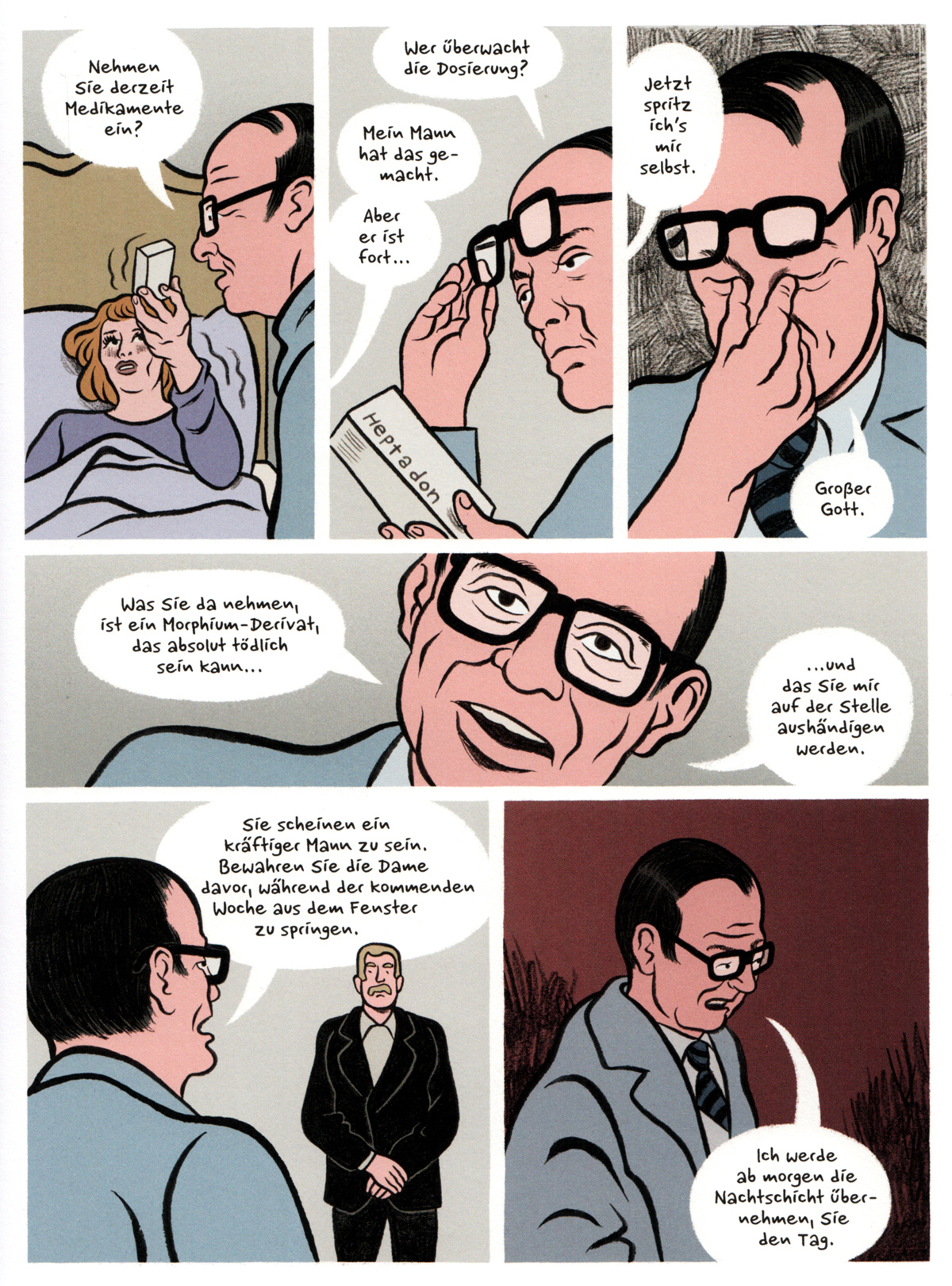 So sehen wir immer wieder großformatige Panels und kapiteltrennende Doppelseiten, die in Chansontexten ein Zwischenresümee präsentieren: