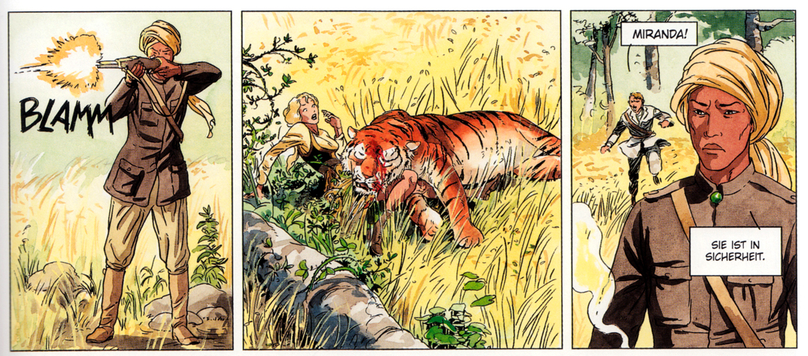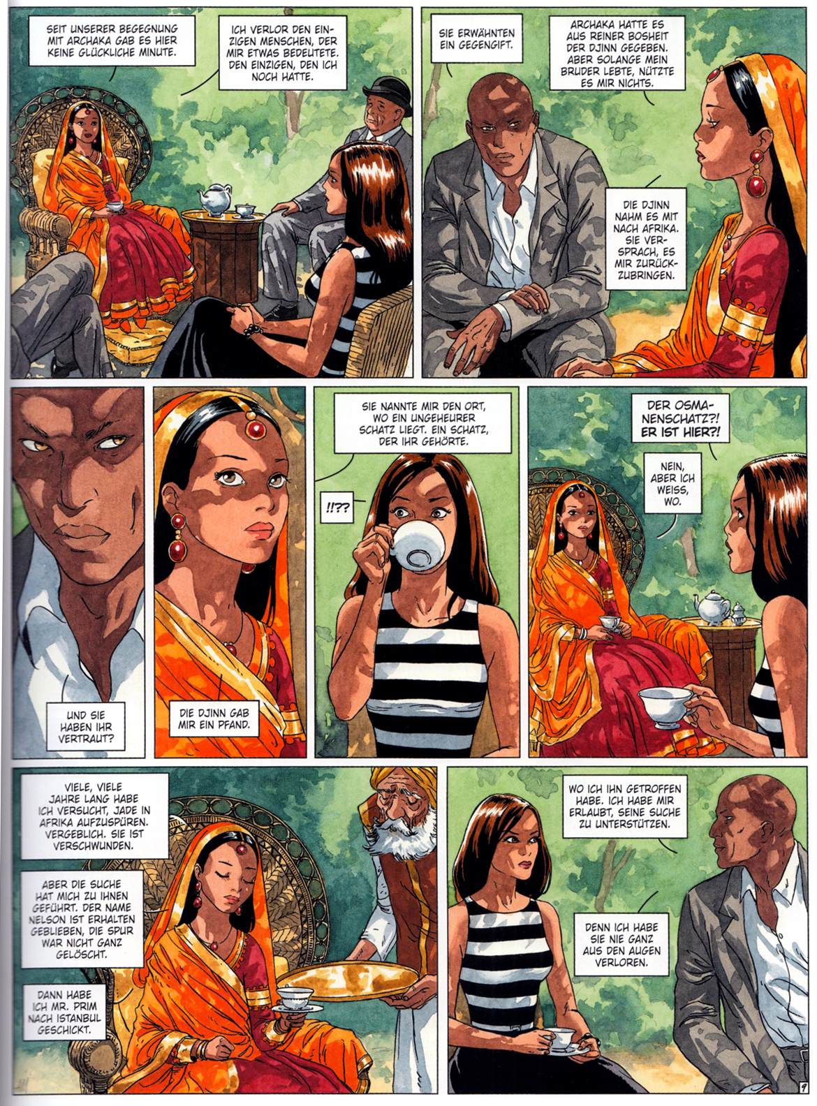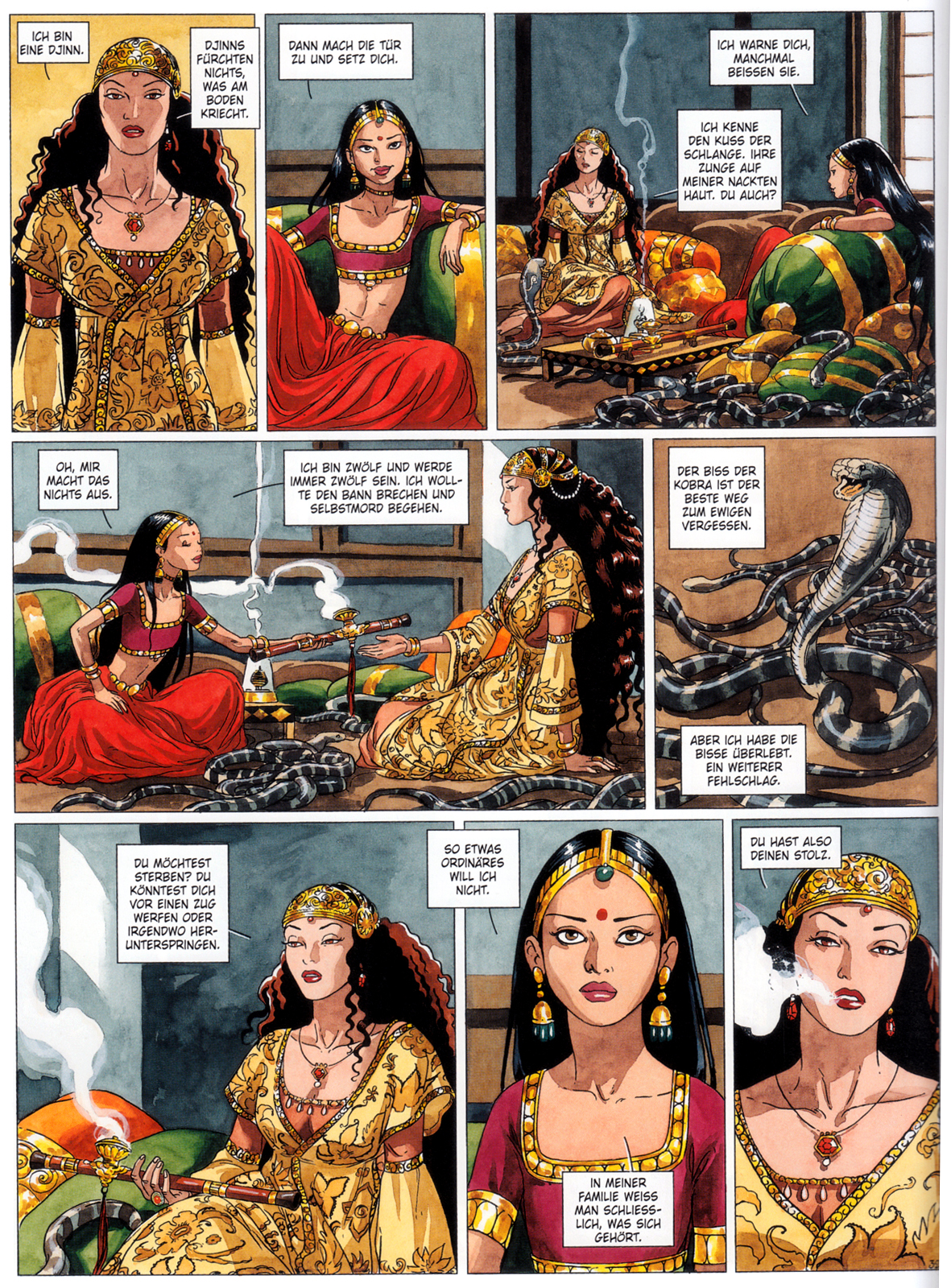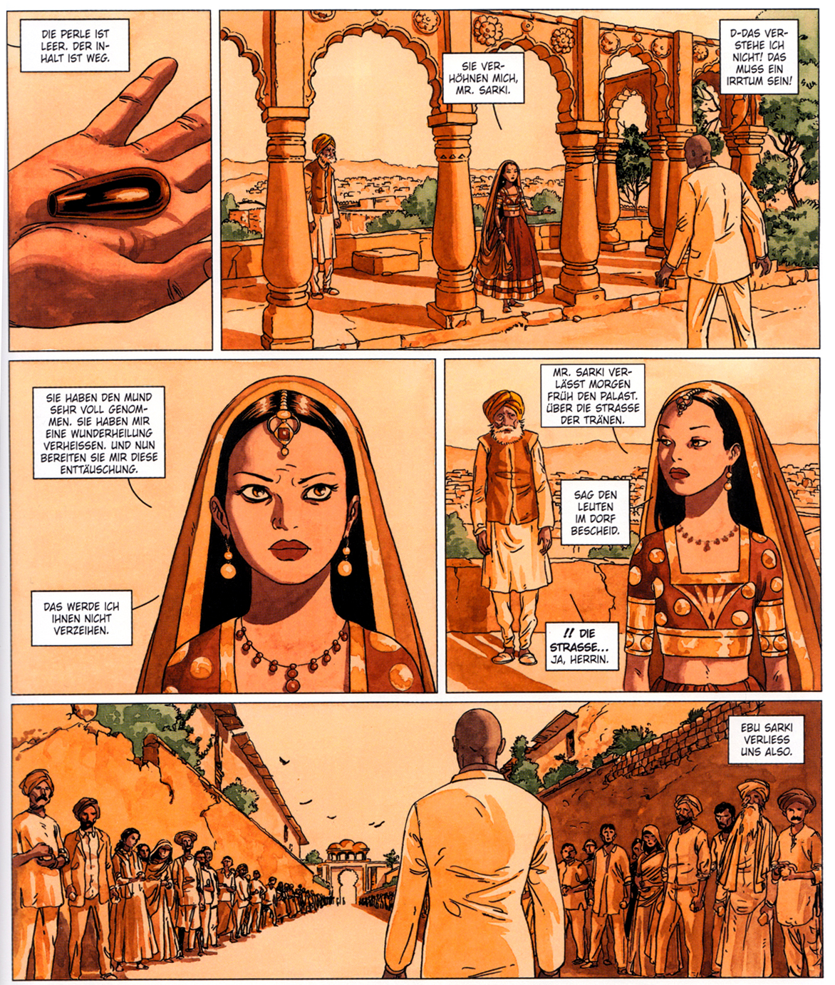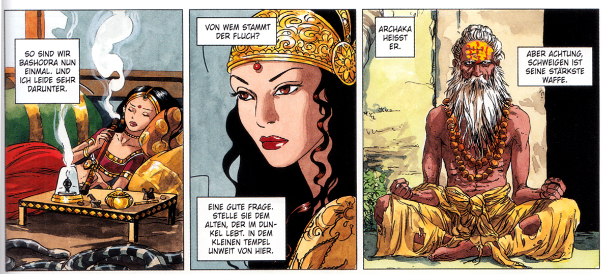 Ich fühle mich unaufdringlich und unweigerlich in exotische Welten entführt, wenn ich diese Seiten aufschlage. Indien ist für uns Europäer nicht zu begreifen, daher versucht der Comic auch gar nicht, uns die Realität zeigen zu wollen.