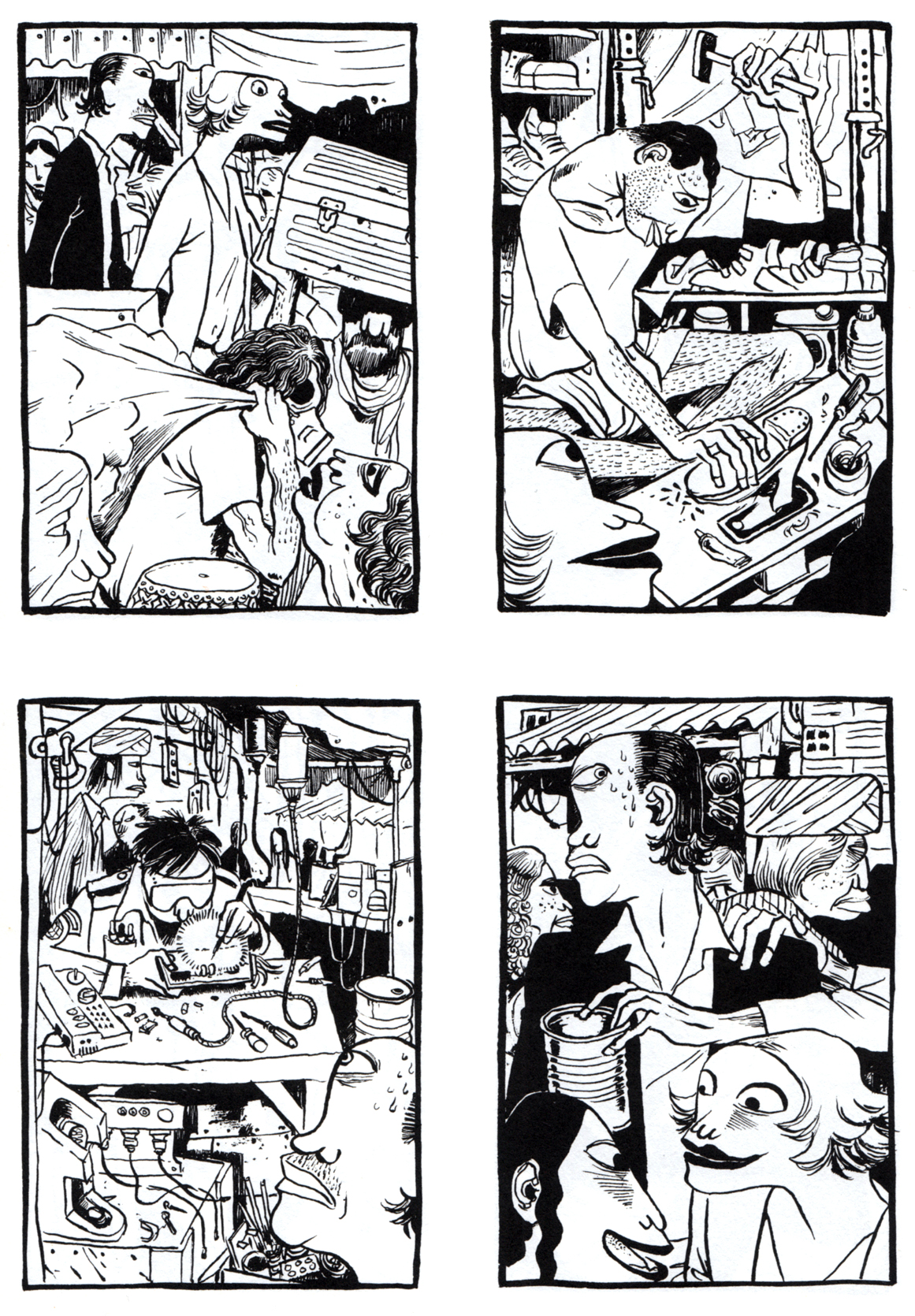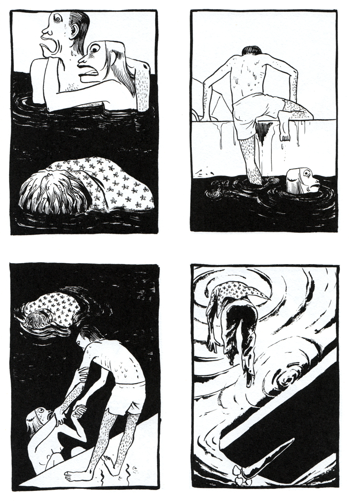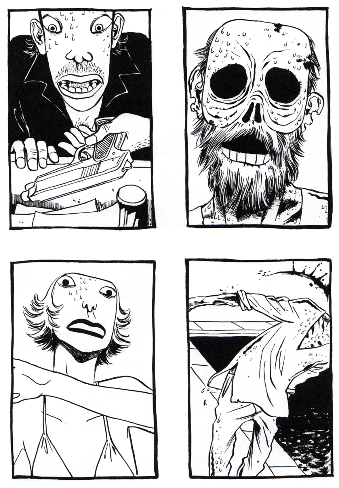 Hier aber komme ich gut mit. Ich wundere mich zwar über die Redundanz mancher Sequenzen (ein Fitnesstraining von vier, ein Drogenrausch von 14 Seiten?), aber ein stummer Comic muss mehr Strecke bieten, um seine Stimmung und Attitüde zu entfalten.