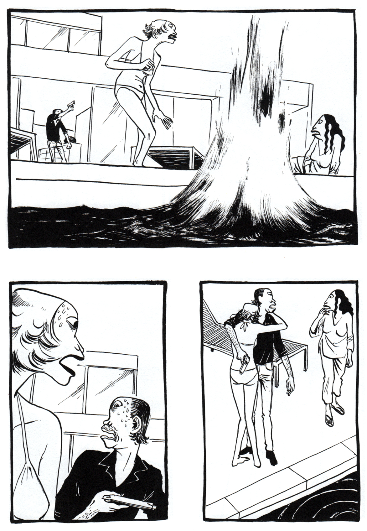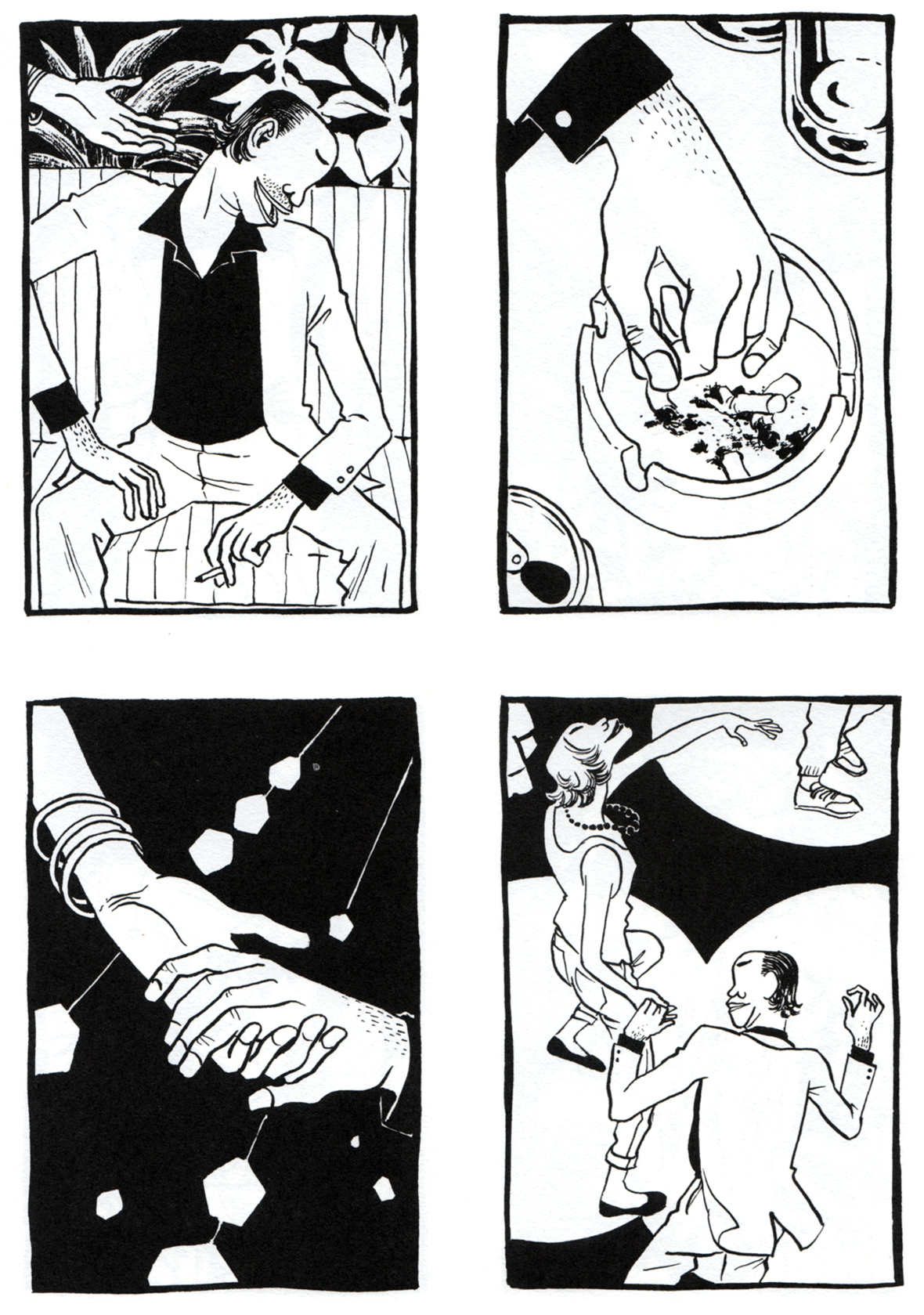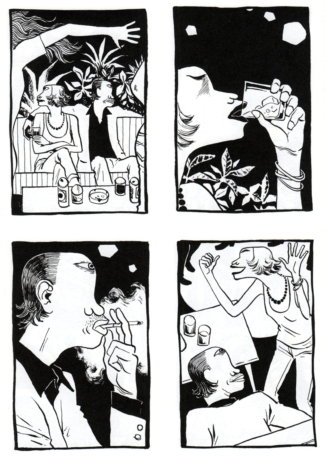 Da sehen Sie unsere Hauptfiguren, ein mutmaßlich verheiratetes Paar ohne Namen, nennen wir sie „die Frau“ und „den Mann“. In einer Disco, irgendwo am Strand, seitenlang.