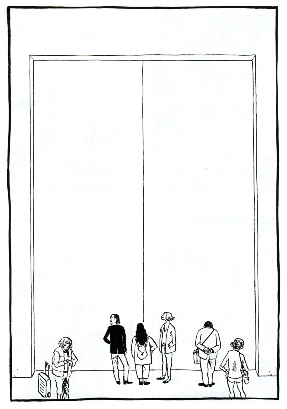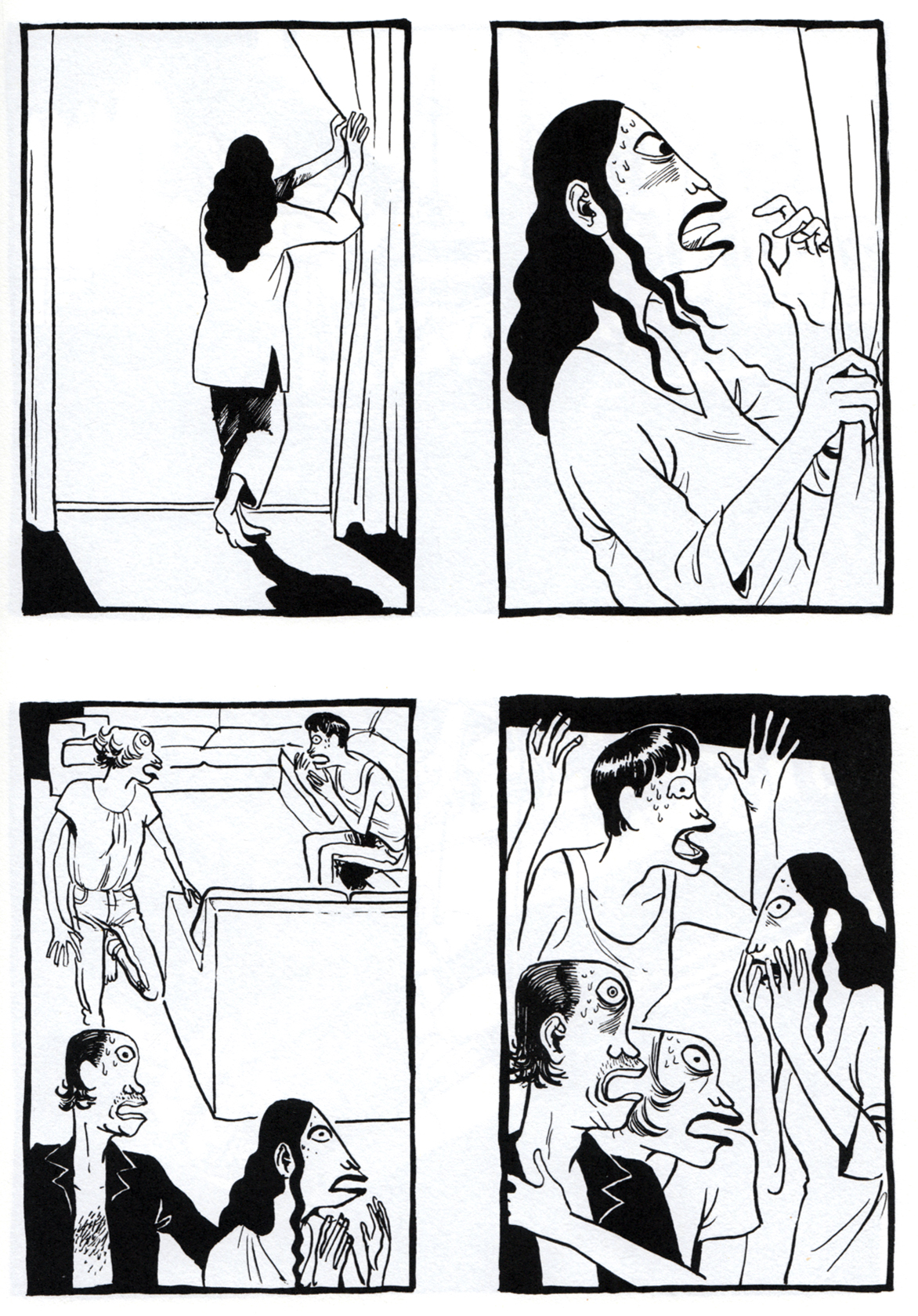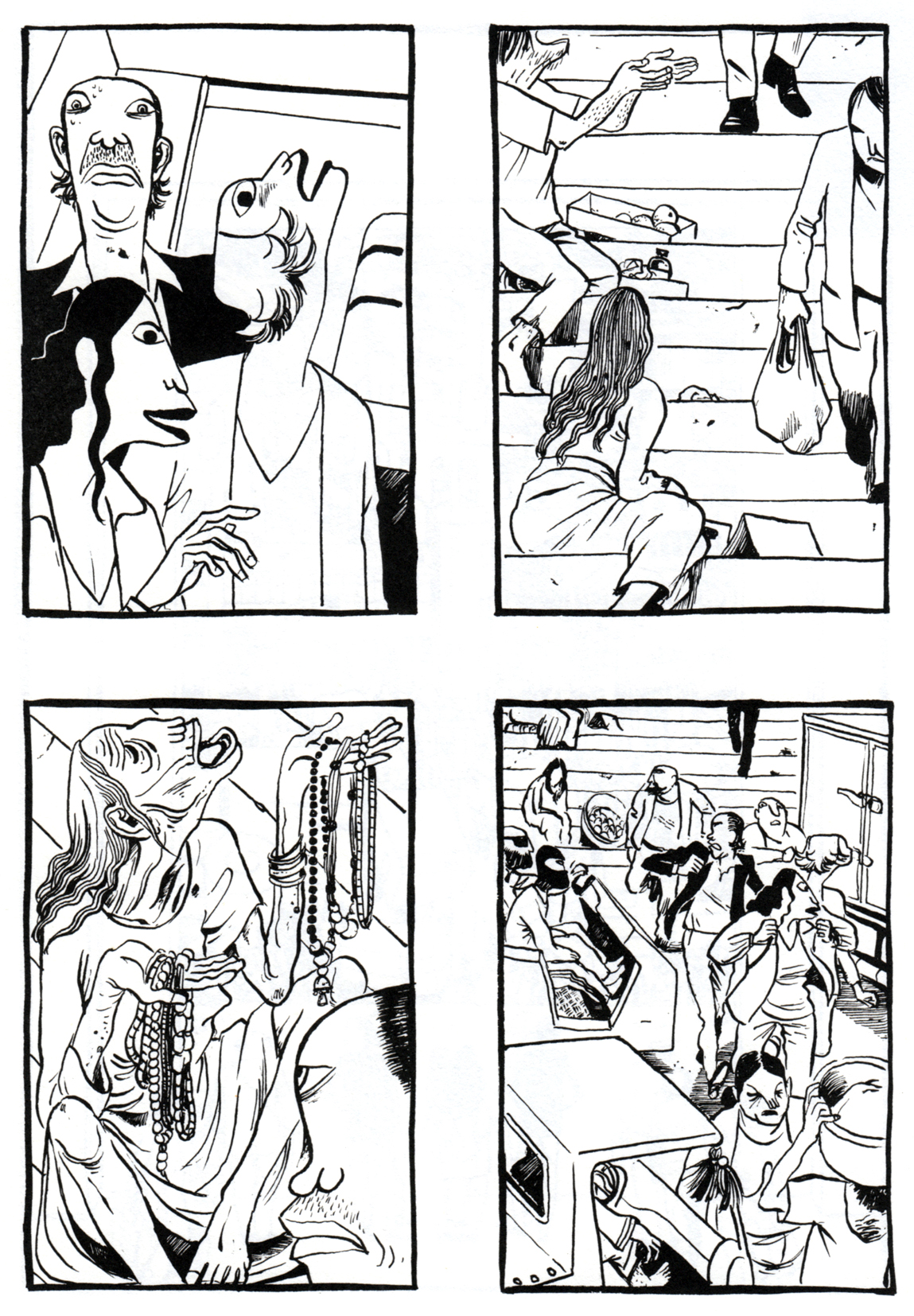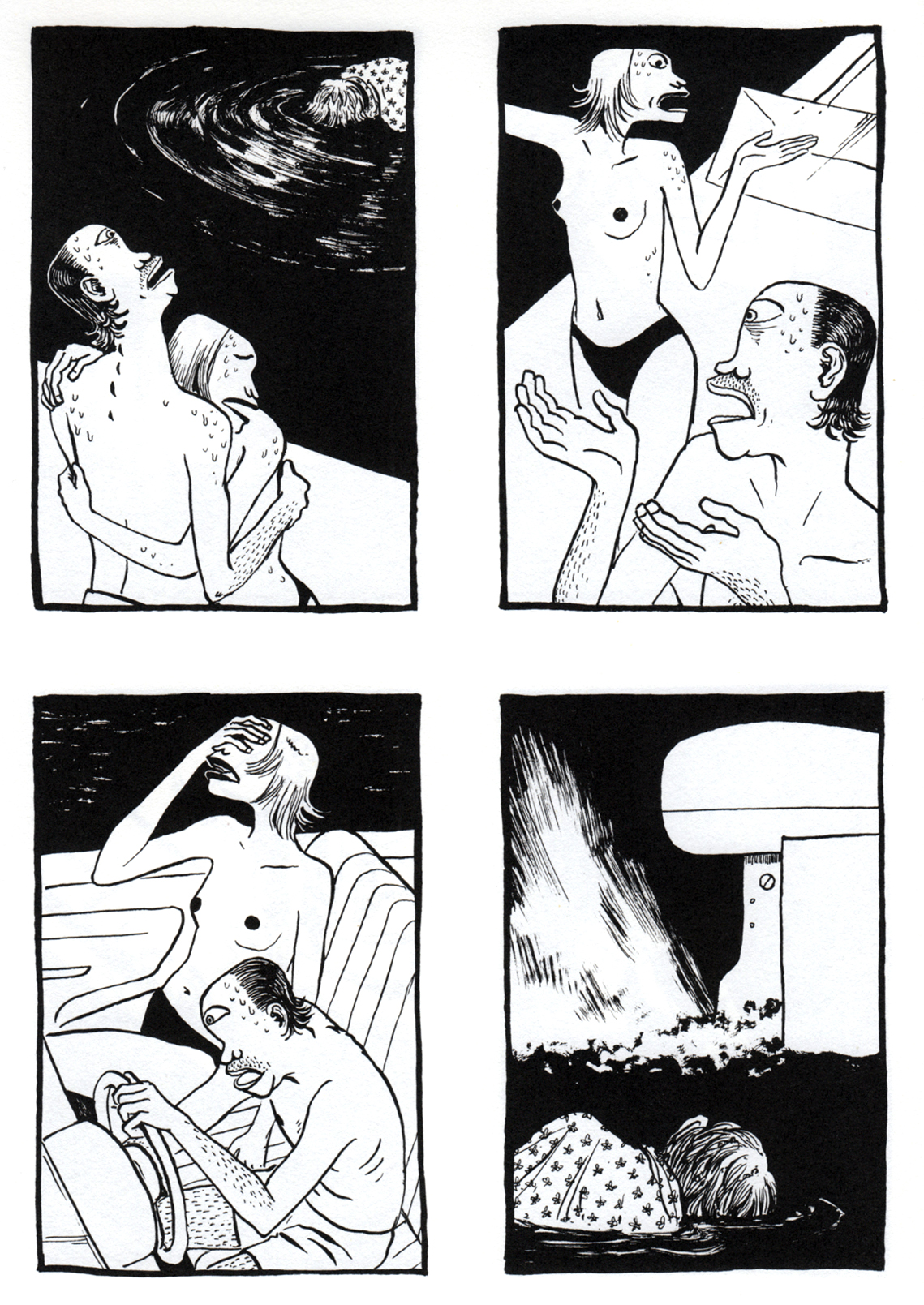 Da sehen Sie unsere Hauptfiguren, ein mutmaßlich verheiratetes Paar ohne Namen, nennen wir sie „die Frau“ und „den Mann“. In einer Disco, irgendwo am Strand, seitenlang.