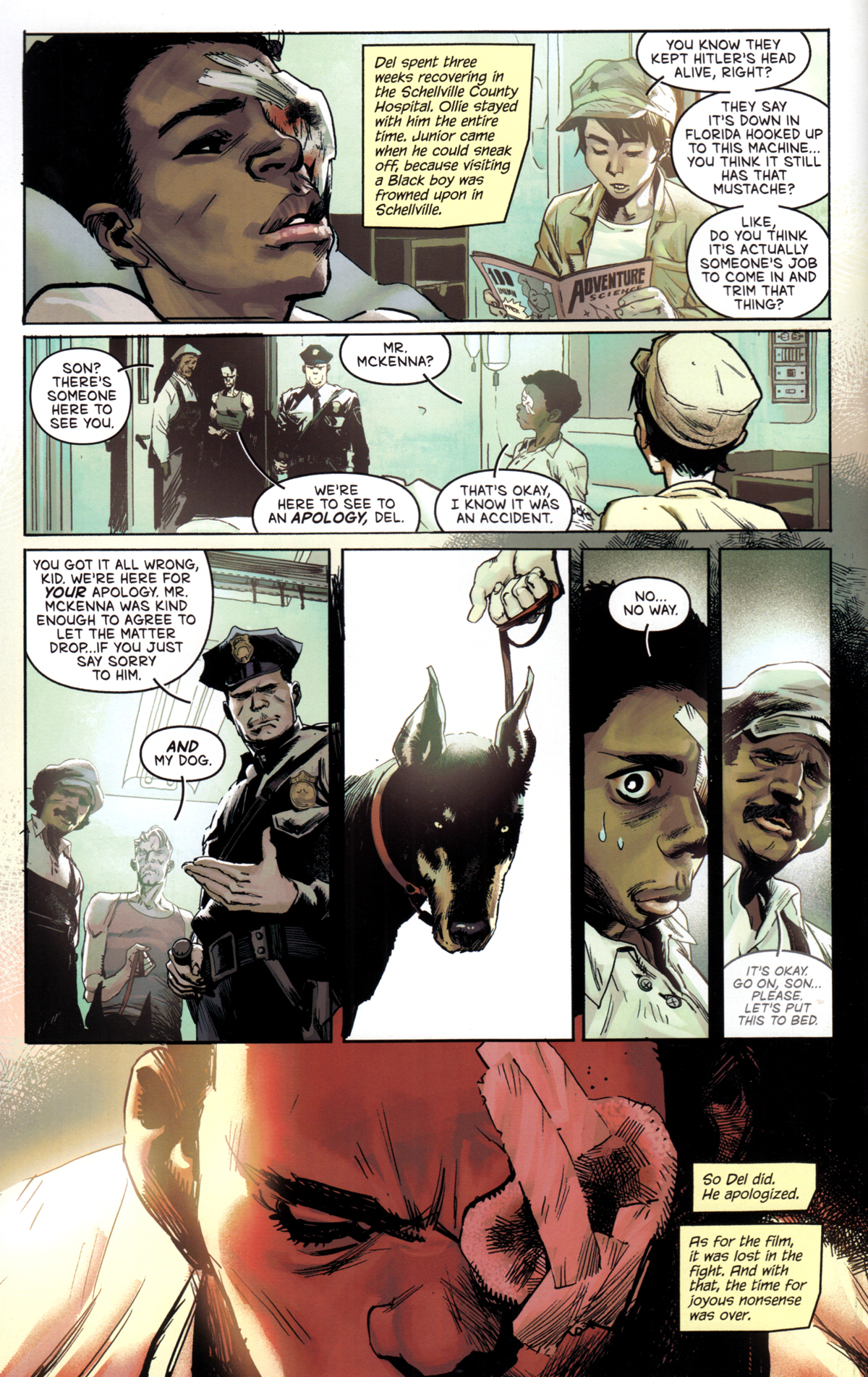 Ollie und Delmont müssen als nichtweiße US-Bürger Schikanen und Spott erleiden, besonders krass ausgestellt in dieser Szene: Del ist bei Dreharbeiten im Gelände eines Schrottplatzes von einem Kampfhund angefallen worden und hat ein Auge verloren.