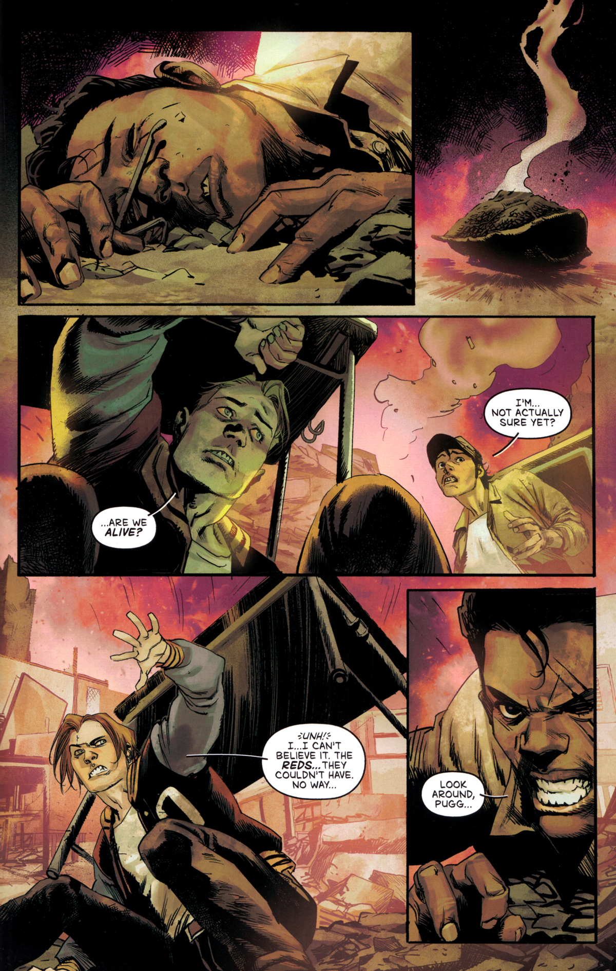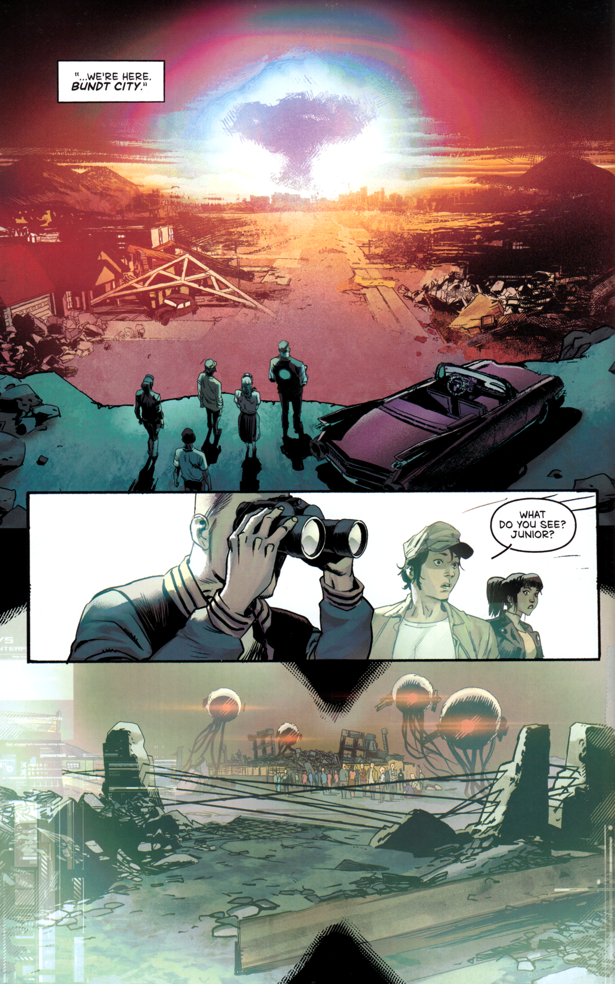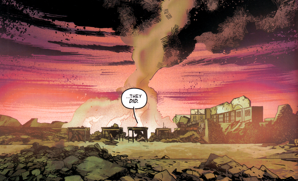 Dieses Szenario nämlich spielt ein US-Comic vom letzten Jahr durch. Eine Gruppe Jugendlicher muss in der Schule nachsitzen und wird Opfer des Atomschlags. Aber da sie sich wie instruiert unter die Tische geflüchtet haben, überleben sie und treten in eine Welt hinaus, die nicht nur zerstört ist, sondern zudem von grotesken Aliens beherrscht wird.