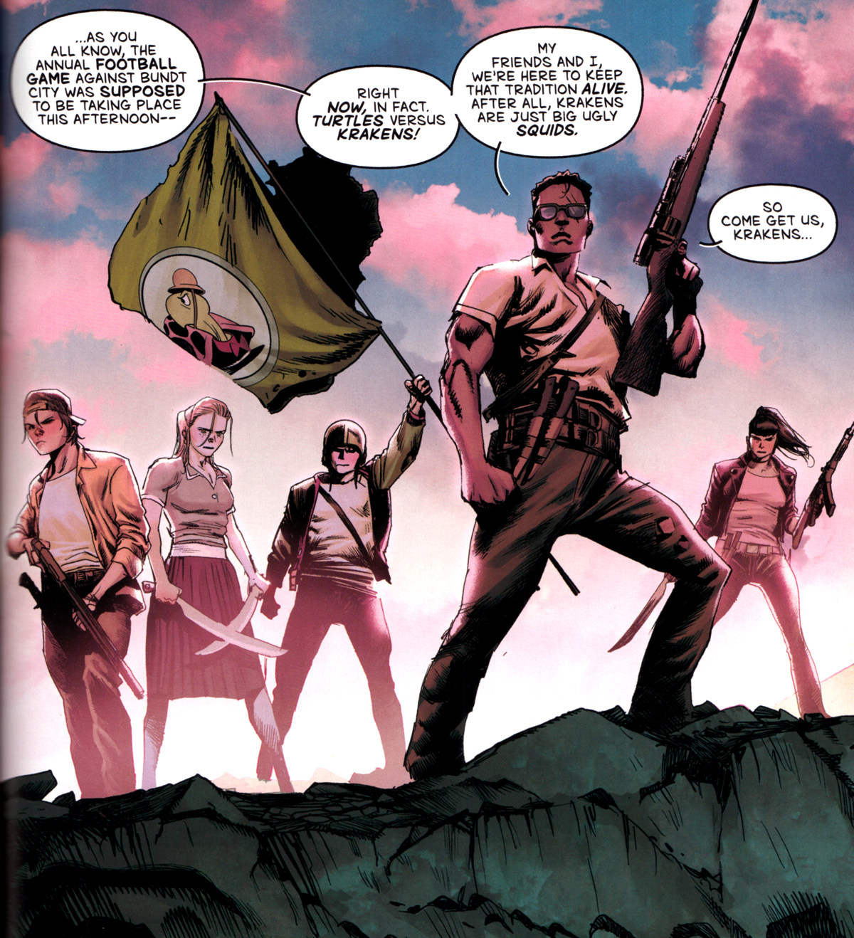 (Halt, nicht ganz. Jugendliche in einer postapokalyptischen Welt kämpfen gegen übermächtige Monster? Beim zweiten Durchgang fühle ich mich an Snyders Schwesterserie NOCTERRA erinnert, auch nicht übel, die gibt’s auf Deutsch bei CrossCult.)