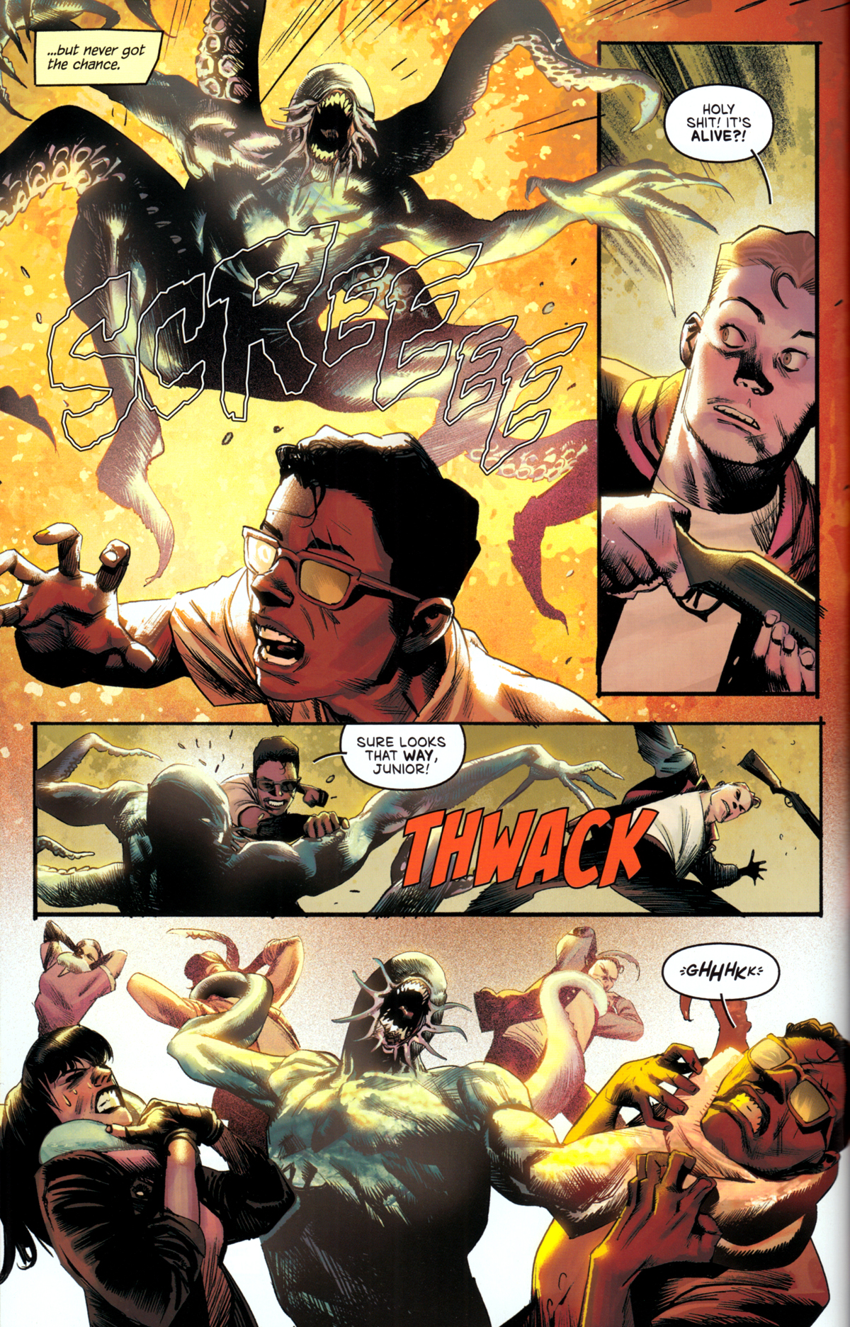 Auch hier schlägt der Comic herrlich über die Stränge, indem er eine Cthulhu-Gestalt als fünfarmigen Tentakel-Predator darstellt, der sich alle fünf Gegner gleichzeitig greifen kann.