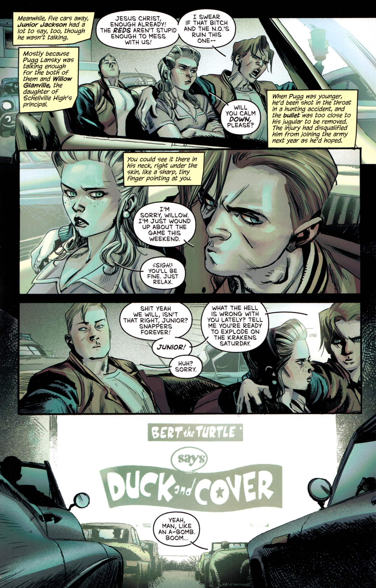 Hier sehen wir Pugg mit Willow und Junior im Autokino. Sie reden über das anstehende Footballmatch mit der konkurrierenden Highschool und müssen als Vorfilm das dämliche „Duck and Cover“ über sich ergehen lassen.