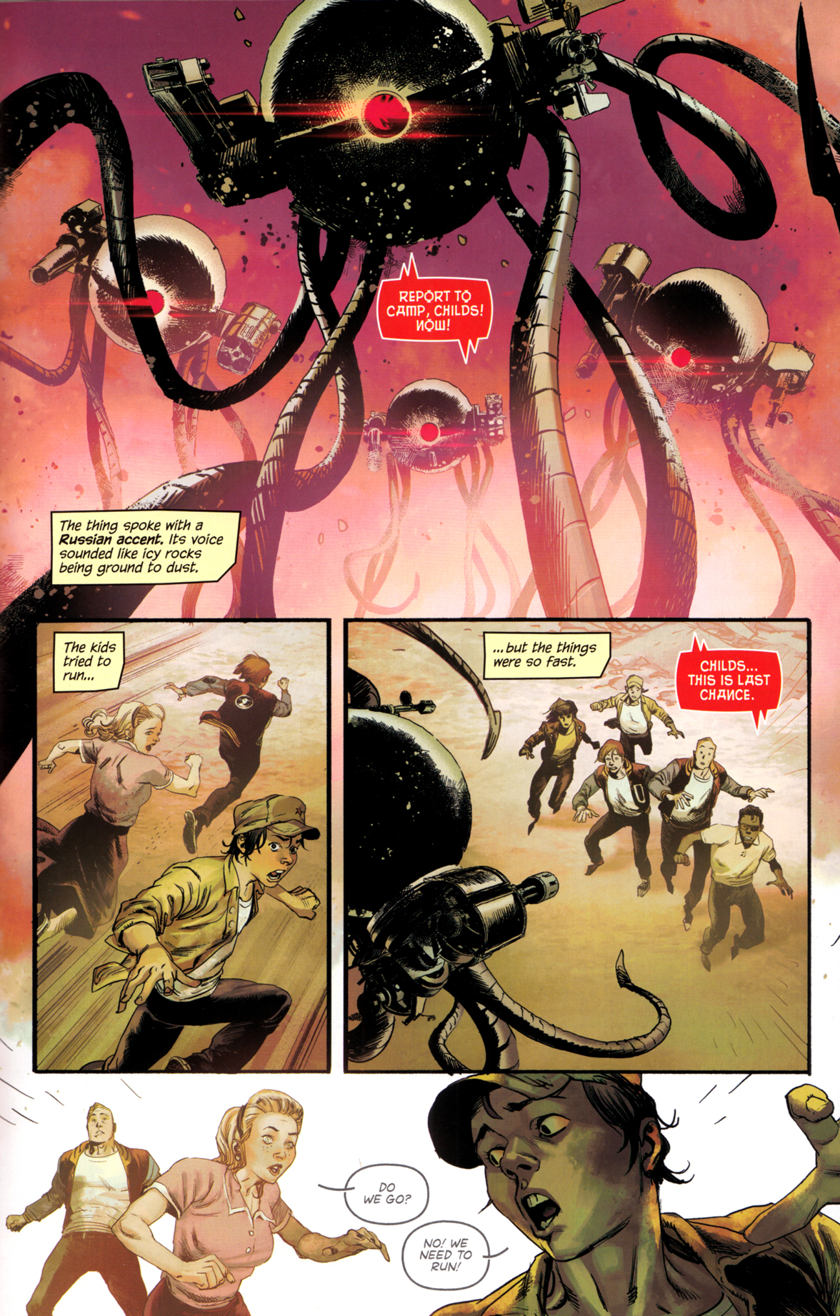 Wie gesagt: Es knallt am Ende von Kapitel eins, die Welt liegt in Scherben – und außerirdisch wirkende Kampfroboter, die mit russischem Akzent Befehle schnarren, fangen sämtliche Jugendlichen ein und bringen sie in Arbeitslager.