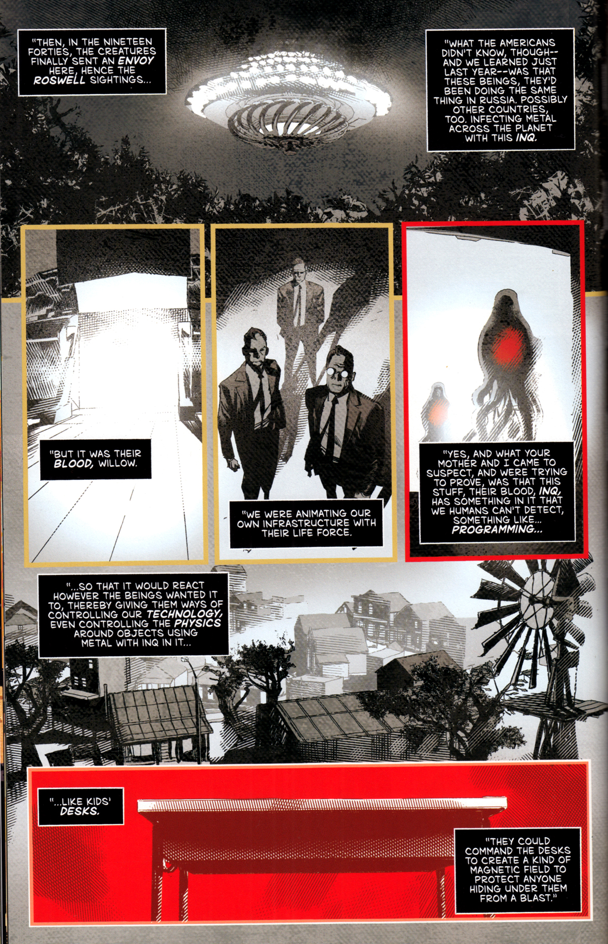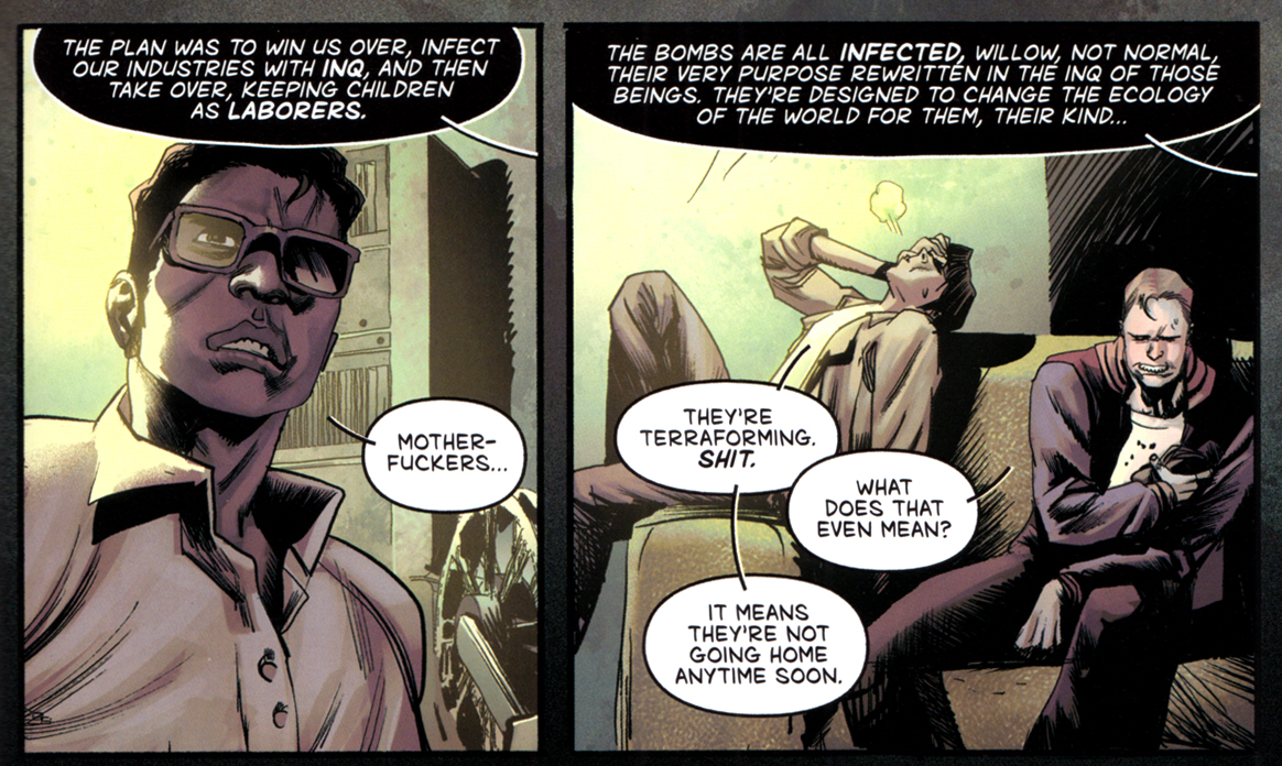 Die Erklärung für die schützenden Schultische wird übrigens bald geliefert: Die Aliens haben bereits vor 200 Jahren im Blut von Walen und Tintenfischen eine organische Supersubstanz namens Inq auf die Erde geschleust und in die Wirtschaftskreisläufe eingebracht.