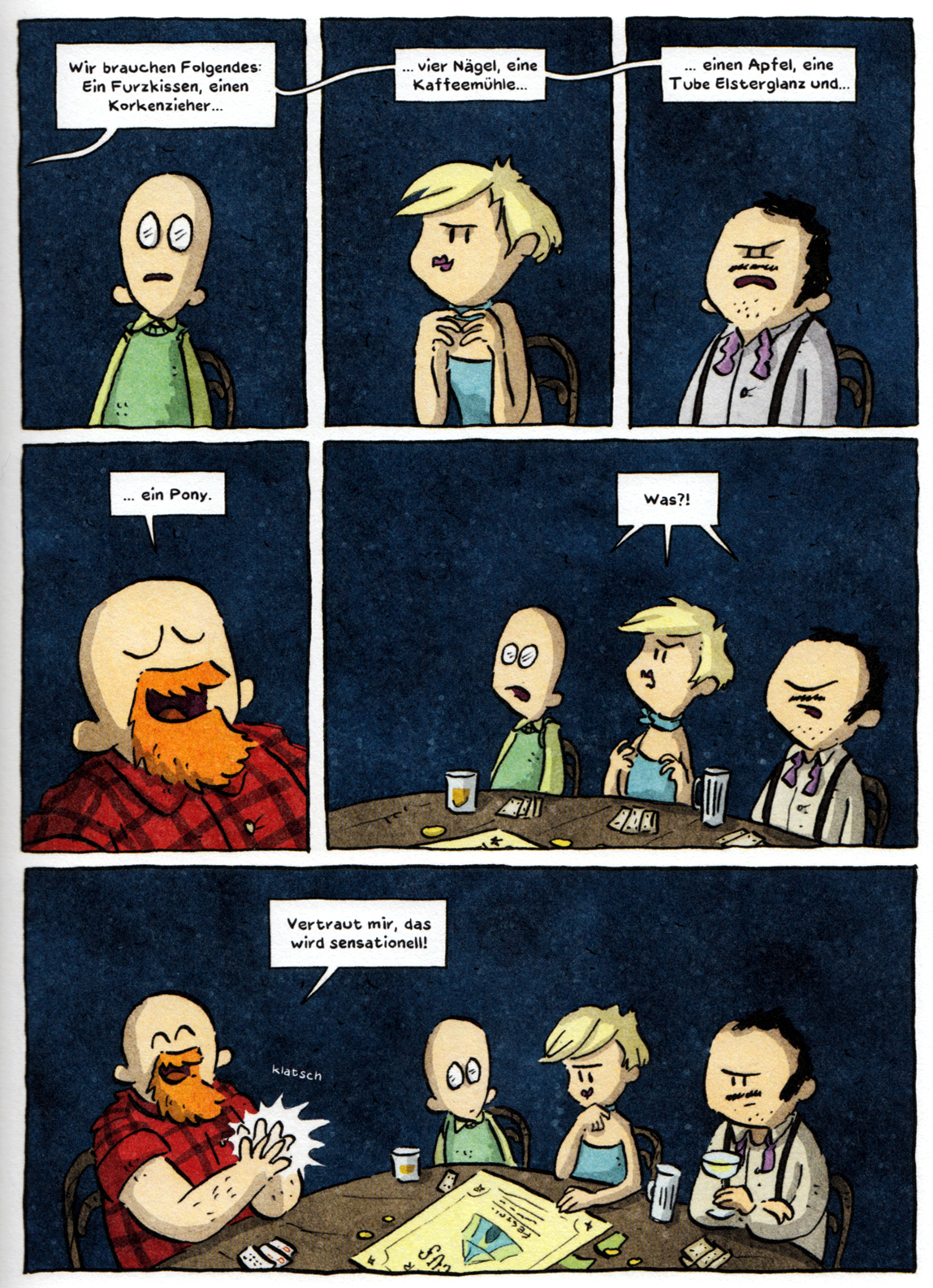 Der Coup an sich wird nicht gezeigt, das ist einerseits eine Pointe für sich, andererseits sind die angekündigten Requisiten (Furzkissen, Korkenzieher, Kaffeemühle) pure Teaser gewesen. Schade.