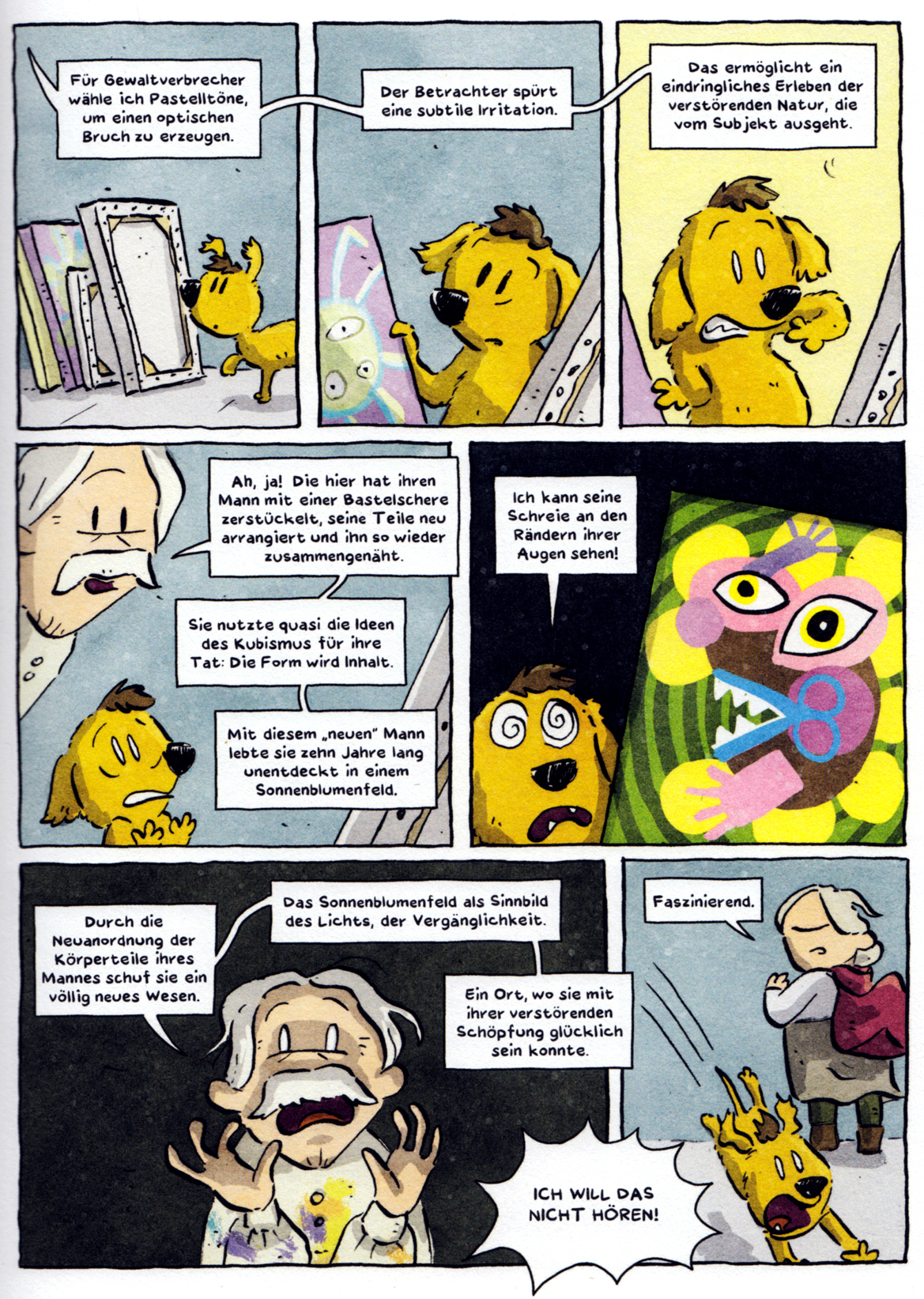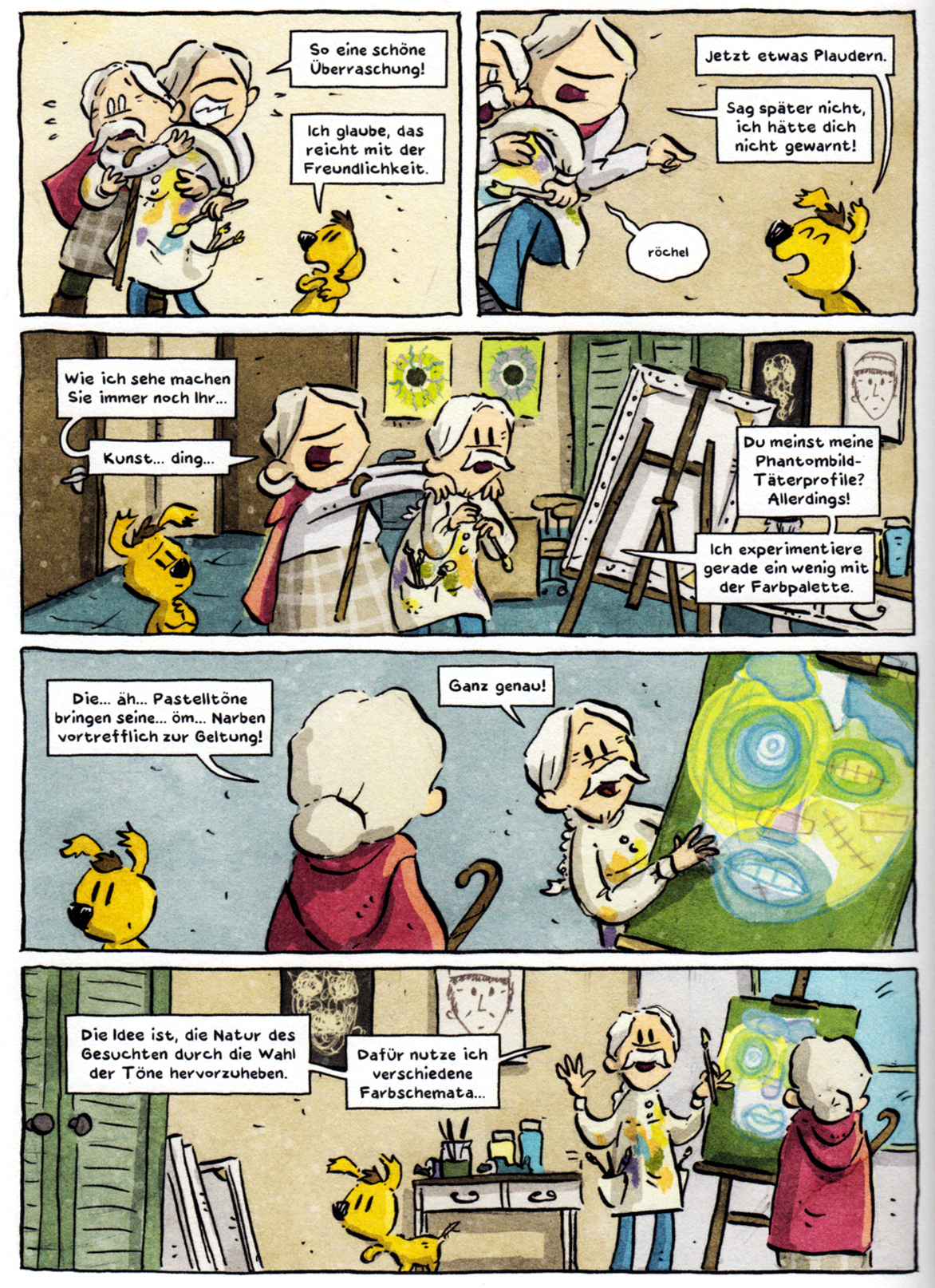 Hier sehen wir beispielsweise den gealterten Dorfkommissar, der sich schon immer mehr für Malerei als Kriminalistik interessiert hat. Wieder eine spinnerte Sequenz, die Marks Humor bestens illustriert: