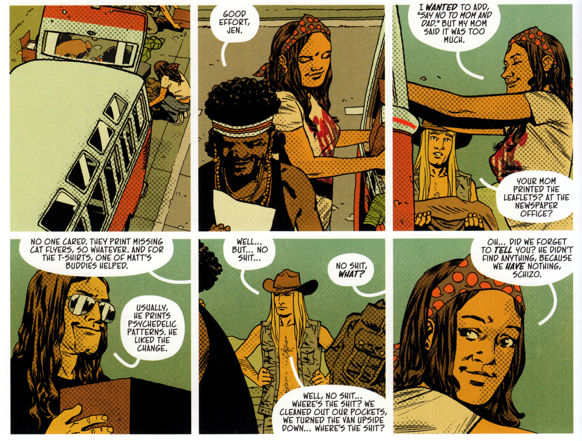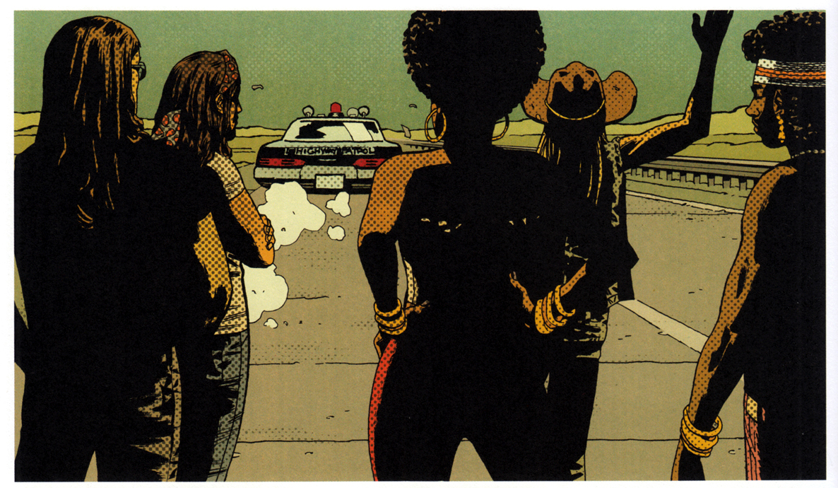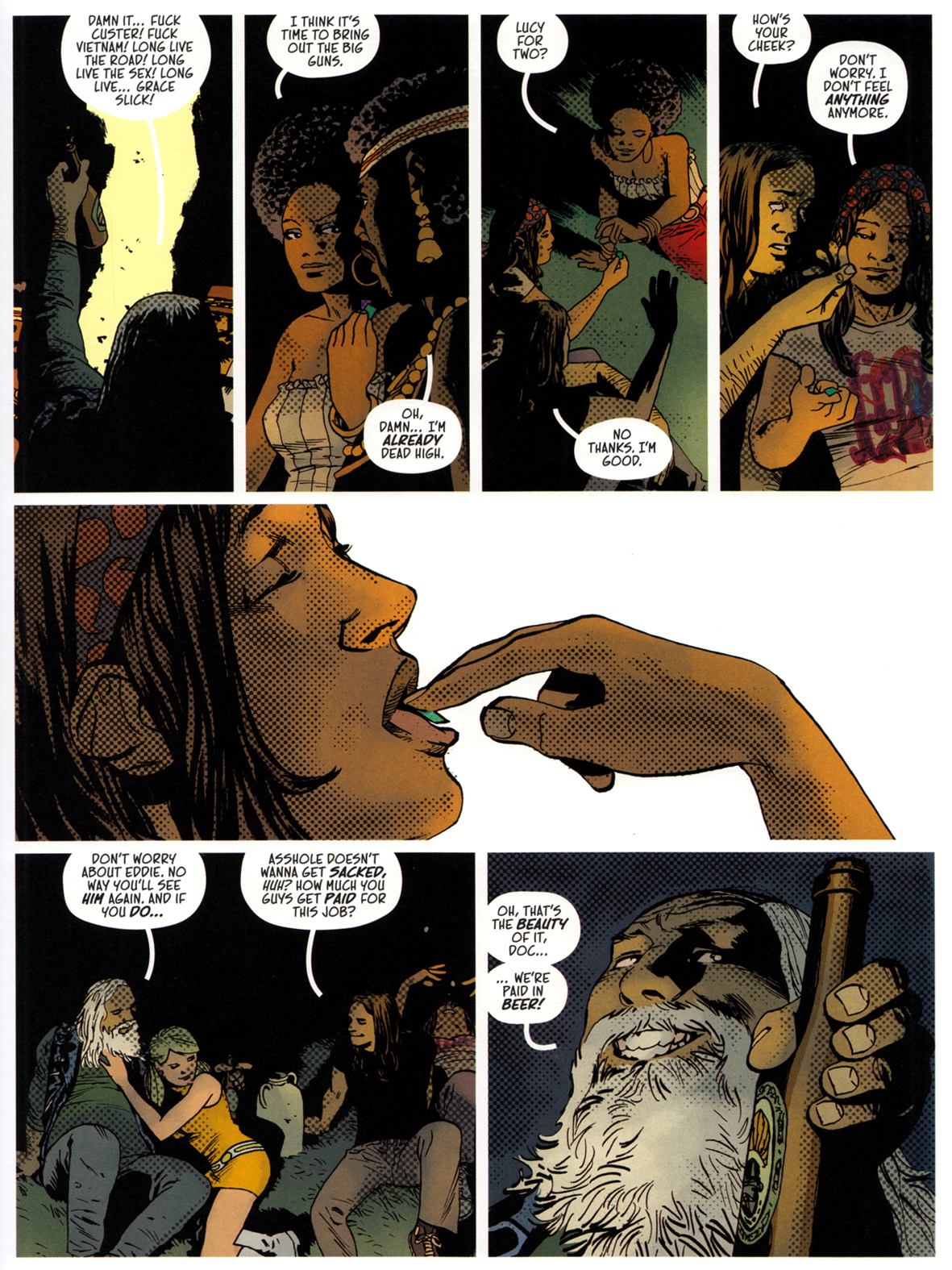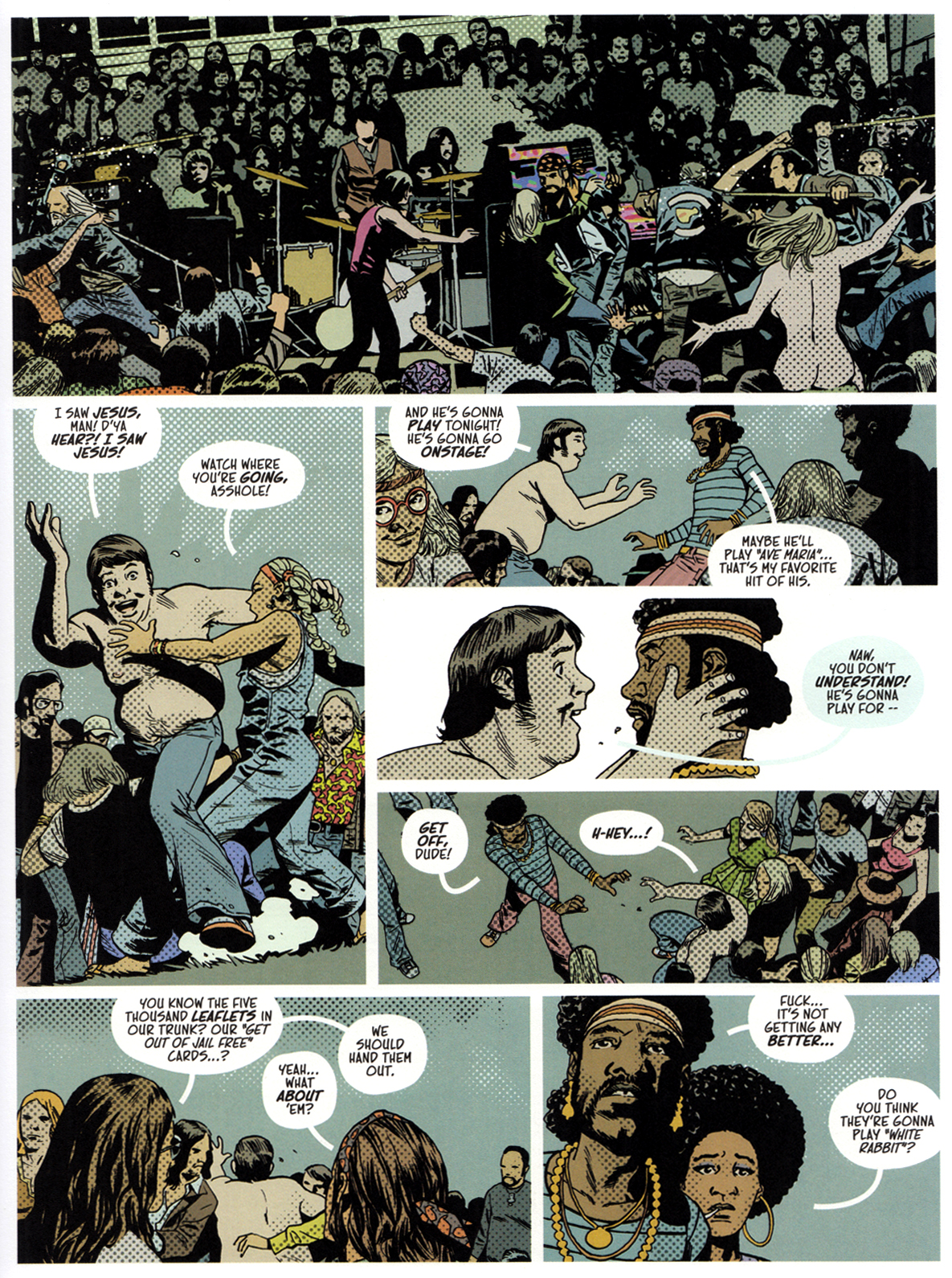 Adlard widersteht der Versuchung, die Chose bonbonbunt zu machen – bis auf einige LSD-Fantasien. Klugerweise koloriert er Tagesszenen in gedeckten Rot-Gelb-Braun-Tönen und die Festivalnächte in Schwarz-Blau-Weiß.