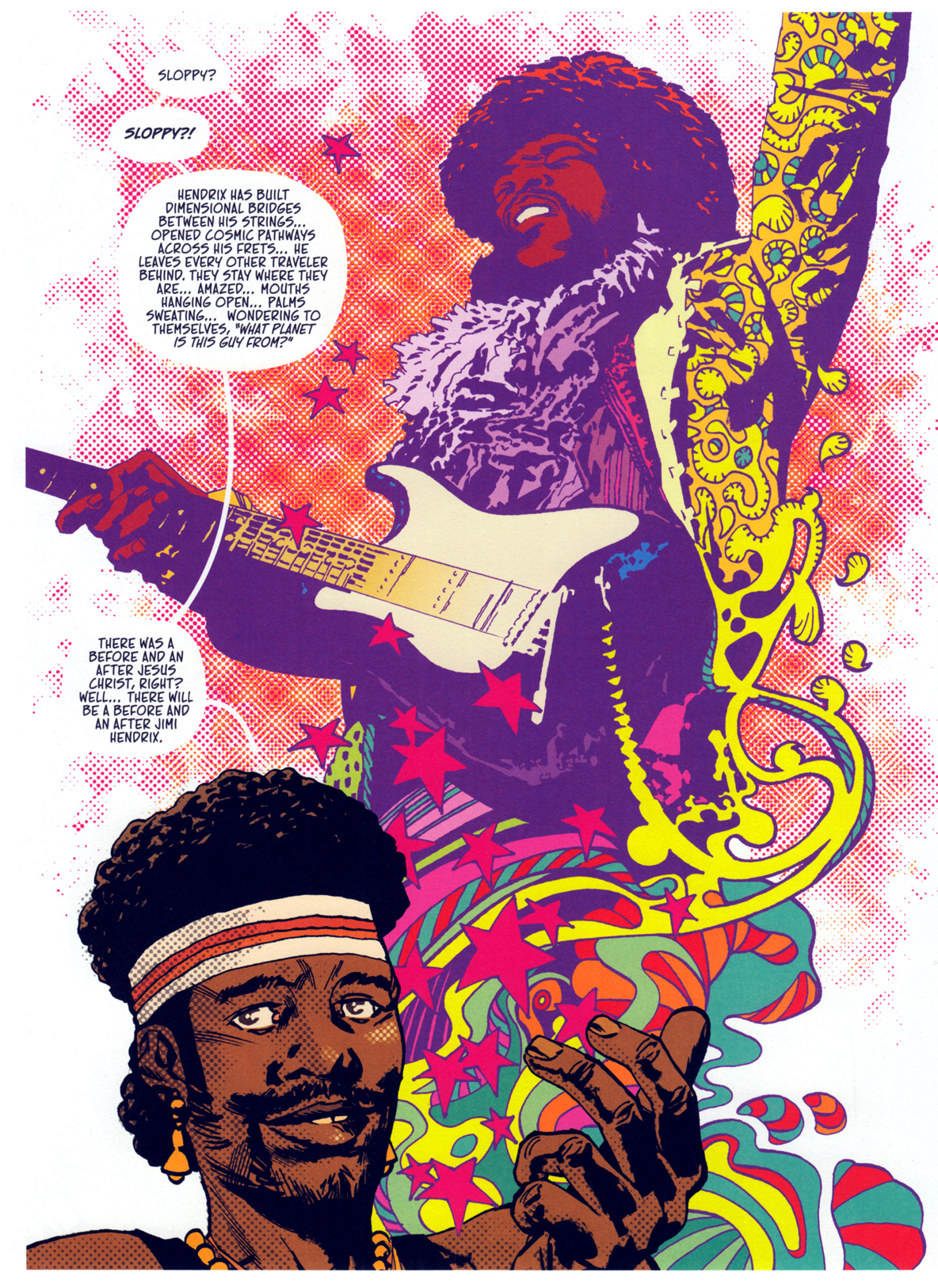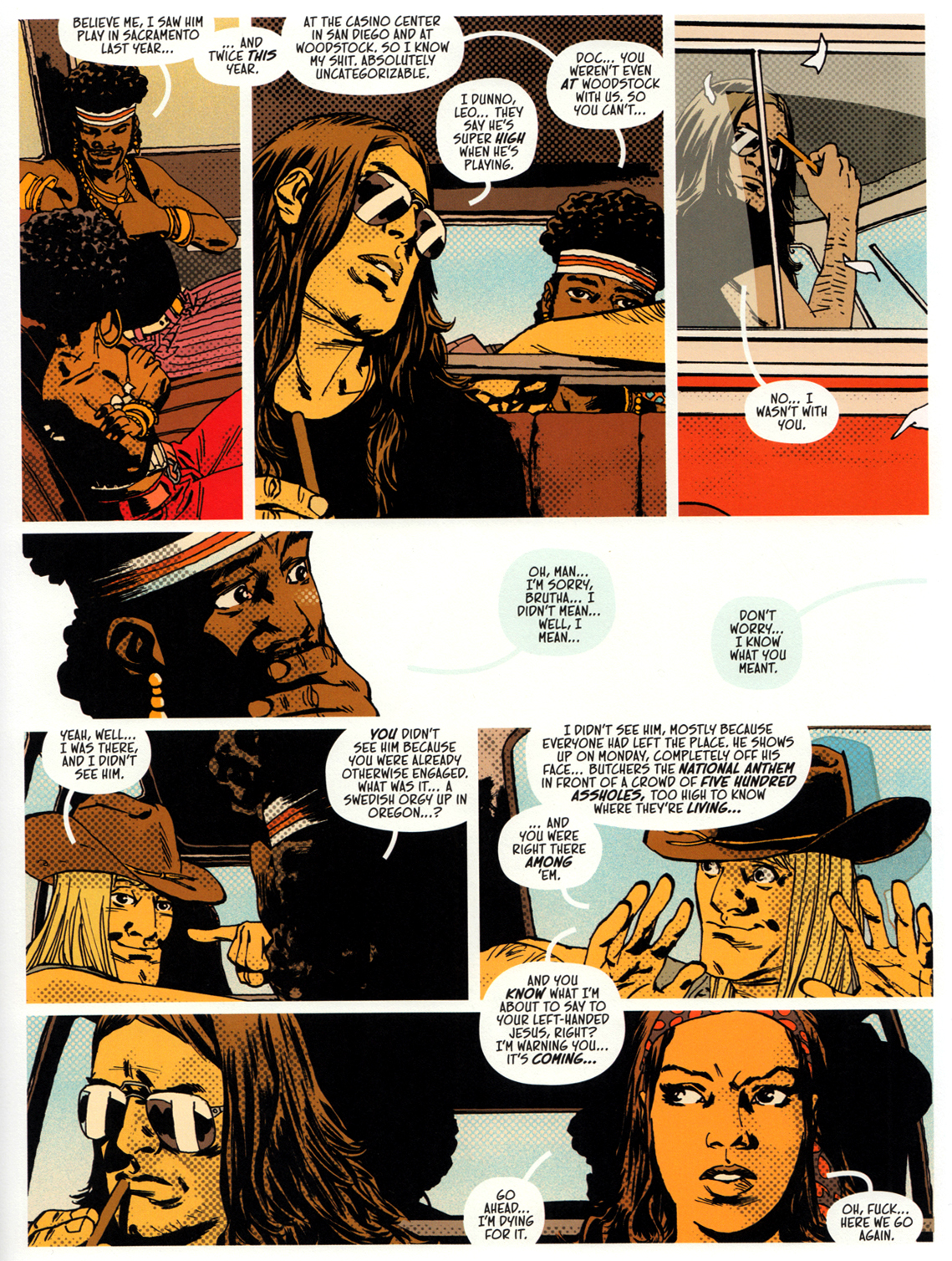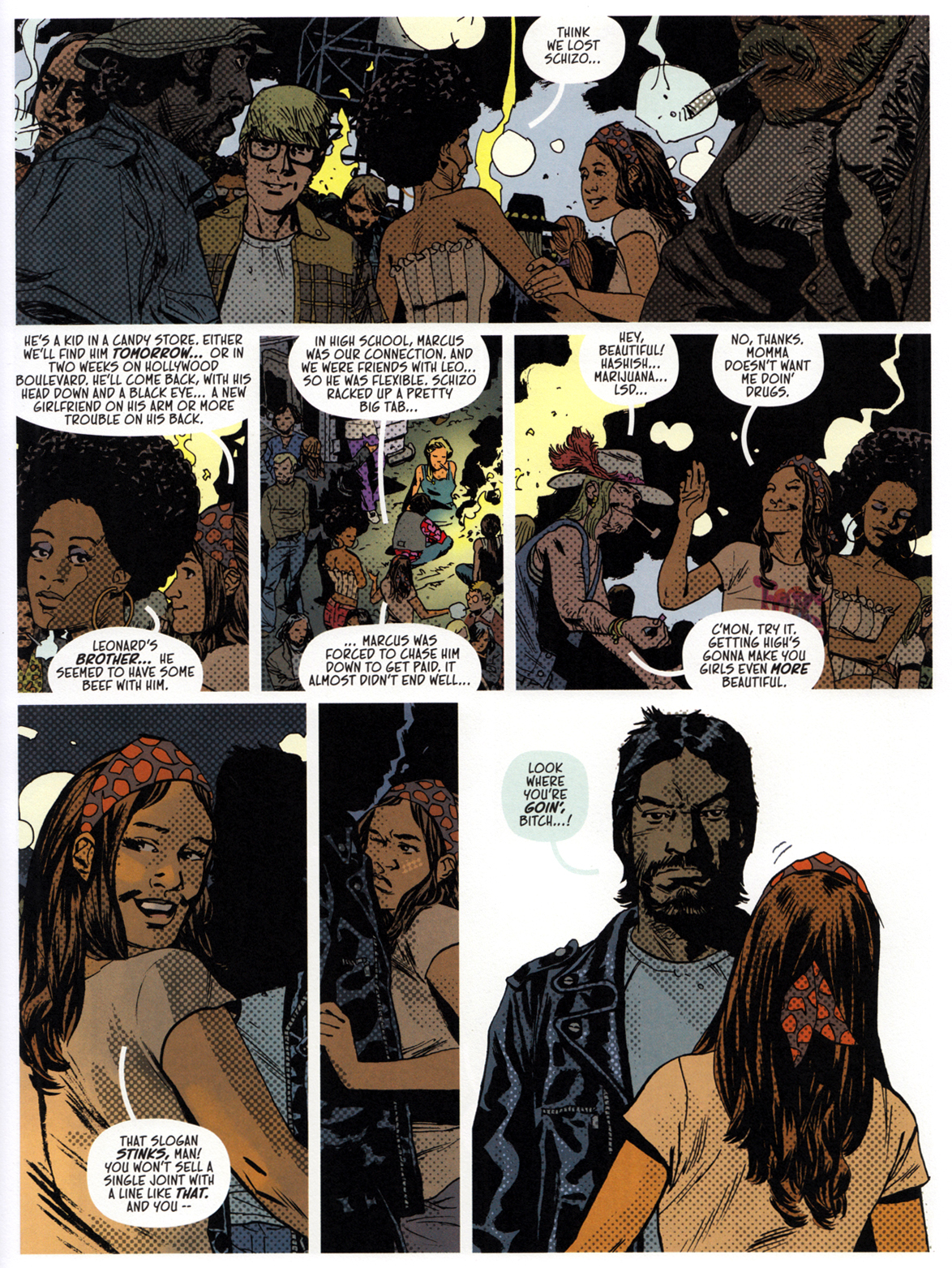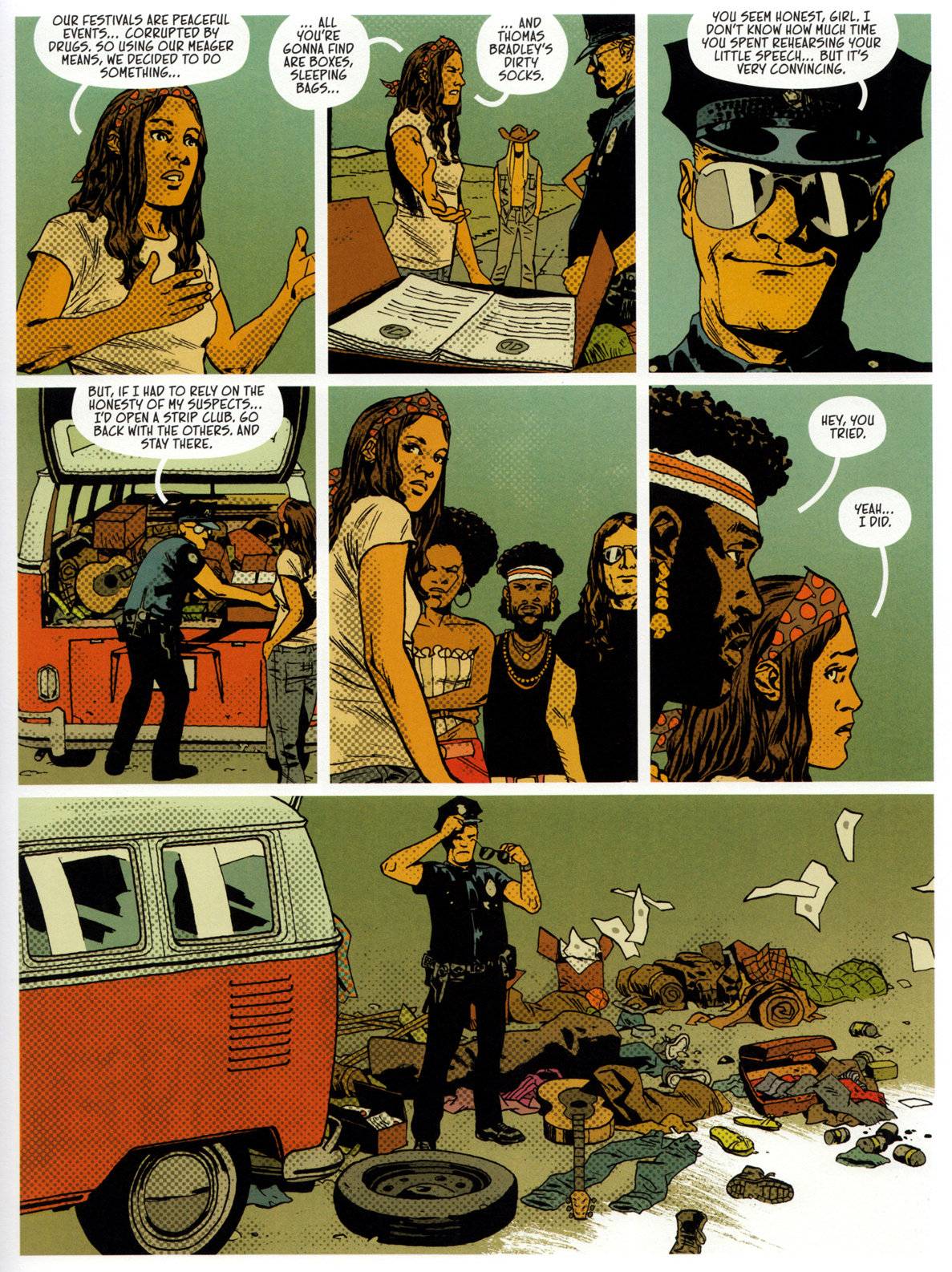Adlard widersteht der Versuchung, die Chose bonbonbunt zu machen – bis auf einige LSD-Fantasien. Klugerweise koloriert er Tagesszenen in gedeckten Rot-Gelb-Braun-Tönen und die Festivalnächte in Schwarz-Blau-Weiß.