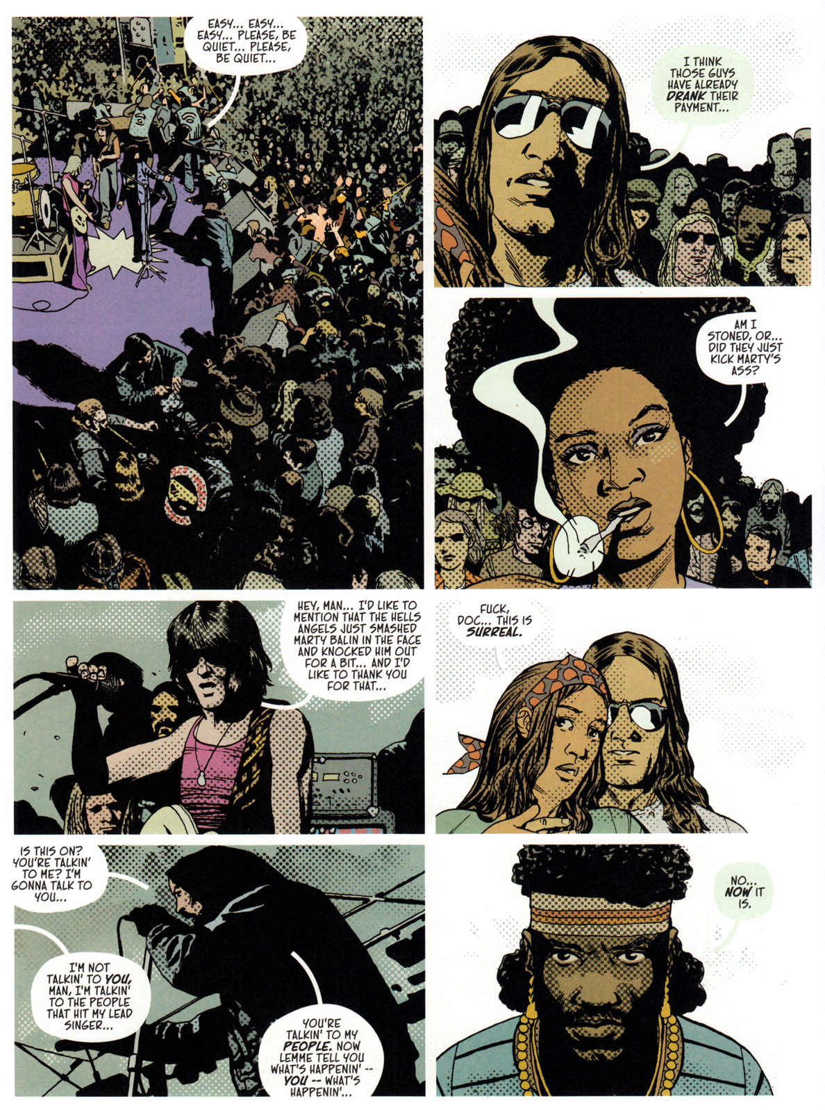 ALTAMONT baut sich über Dutzende Seiten langsam auf, charakterisiert seine Figuren behutsam und wirkt beinahe banal – bis wir in der Buchmitte nach Altamont kommen und unsere fünf Protagonisten sich unter das Festivalpublikum mischen.